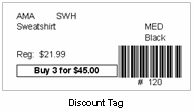 Discount Tags: (Pro) Includes the regular item price and the discount terms and price. Shown is a sample tag for a "X for $Y" discount type. Available for discount prices only. View Sample